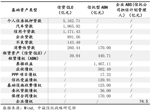 Ò»ÊÇп¯Ðлù´¡×ʲúÀàÐ͸»ºñ¡£ÐÅ´ûCLO»ù´¡×ʲúÇéÐη½Ã棬2019Äêп¯ÐÐÐÅ´ûCLO¹²Éæ¼°ÆßÀà»ù´¡×ʲú£¬ÆäÖÐСÎÒ˽¼Òס·¿µäÖÊ´û¿î¡¢Æû³µ´û¿î¡¢ÐÅÓÿ¨´û¿îÀà»ù´¡×ʲúµÄп¯ÐйæÄ£ÅÅÃûǰÈý£¬¹æÄ£»®·ÖΪ5162.71ÒÚ¡¢1965.92ÒÚºÍ1171.43ÒÚ£¬¹æÄ£Õ¼±È»®·ÖµÖ´ï54%¡¢20%ºÍ12%£¬Í¬Ê±½Ï2018ÄêÐÂÔöPPPÏîĿծȨÀà»ù´¡×ʲú¡£ABN»ù´¡×ʲúÇéÐη½Ã棬2019Äêп¯ÐÐABN¹²Éæ¼°¾ÅÀà»ù´¡×ʲú£¬ÆäÖÐÆ±¾ÝÊÕÒæ¡¢Ó¦ÊÕծȨ¡¢×âÁÞծȨÀà»ù´¡×ʲúµÄп¯ÐйæÄ£ÅÅÃûǰÈý£¬¹æÄ£»®·ÖΪ1467.11ÒÚ¡¢502.40ÒÚºÍ440.71ÒÚ£¬¹æÄ£Õ¼±È»®·ÖµÖ´ï51%¡¢17%ºÍ15%¡£ÐÅÍй«Ë¾µ£µ±ÍýÏëÖÎÀíÈËµÄÆóÒµABS»ù´¡×ʲú·½Ã棬2019ÄêÉæ¼°µÄ»ù´¡×ʲúËùÓÐΪÆóҵծȨ£¬´Ó»ù´¡×ʲú¶þ¼¶·ÖÀà½Ç¶È£¬74.5ÒڵĹæÄ£Ïêϸ°üÀ¨ÐÅÍÐÊÜÒæÈ¨40ÒÚ£¬ÆäËûÆóҵծȨ34.5ÒÚ¡£