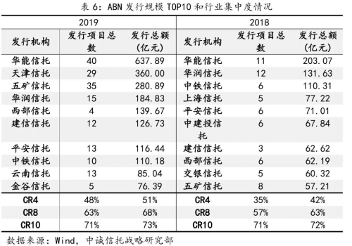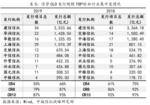 ÈýÊÇÒøÐÐϵºÍÑëÆóϵÐÅÍй«Ë¾×ʲú֤ȯ»¯ÓªÒµÕ¹ÒµÍ»³ö¡£ÐÅ´ûCLO·½Ã棬2019Ä꣬½¨ÐÅÐÅÍС¢»ªÈóÐÅÍС¢»ªÄÜÐÅÍÐп¯ÐйæÄ£Î»¾ÓǰÈý£¬ÆäÖлªÄÜÐÅÍдÓ2018ÄêµÄȱ·¦°ÙÒÚÃÍÔöµ½2019ÄêµÄ¹ýǧÒÚ¡£ABN·½Ã棬2019Ä꣬»ªÄÜÐÅÍС¢Ìì½òÐÅÍС¢Îå¿óÐÅÍÐп¯ÐйæÄ£Î»¾ÓǰÈý£¬Ìì½òÐÅÍС¢ÔÆÄÏÐÅÍС¢½ð¹ÈÐÅÍнÏÉÏÄêнøÇ°Ê®¡£